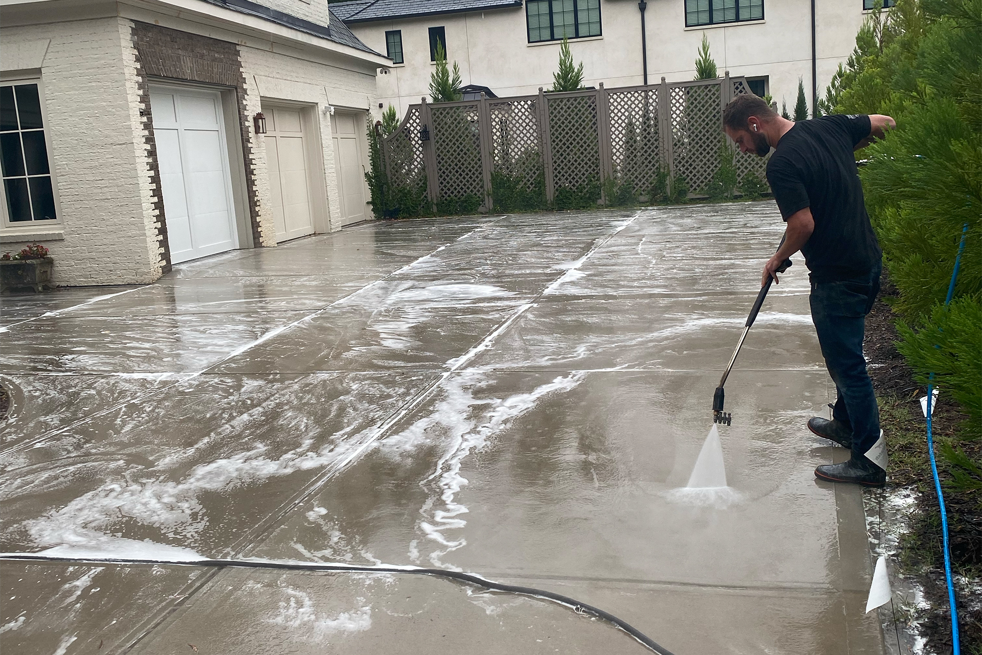 We assess the material type, slope, and problem areas. Plants and landscaping are carefully protected throughout the job. - Pre-Treatment & Degreasing